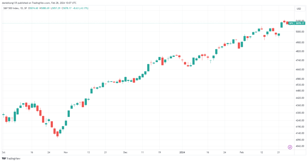 The day after the Nvidia earnings report was announced, its share price jumped from $674.72 to $785.38 on 22 February 2024. This has helped fuel the S&P 500 index to end at a record high on 22 February 2024, gaining 105.23 points or 2.11% to close at 5,087.03 [4].