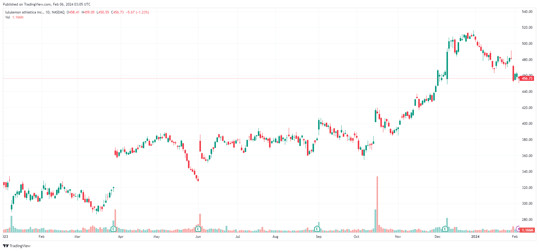 Lululemon Athletica Inc. exhibited notable growth throughout 2023, marked by two significant surges in its stock price. Following its lowest point of the year at $289.14 on 16 March, the stock experienced a spike to $370.25 the subsequent week, culminating in an all-time high of $516.39 just before year-end.