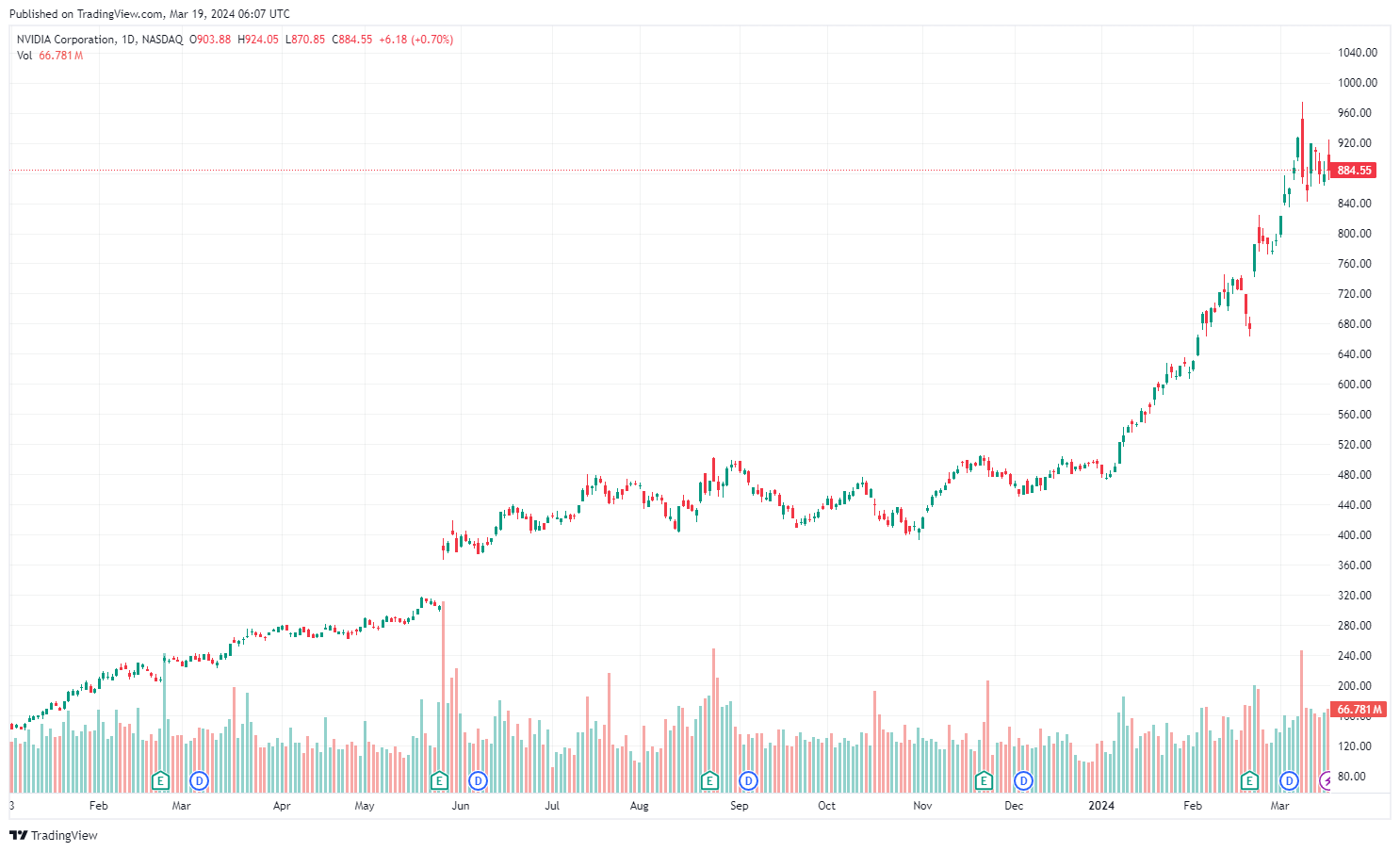 Since the beginning of 2023, NVIDIA Corporation’s stock price has demonstrated an unbroken upward trajectory. NVIDIA’s shares were trading at a price of $143.15 at the outset of January 2023, fast forward to 2024, the share price reached an all-time high of $926.69 on 7 March 2024 — a 547% gain. Just over the past year alone, if you held $1,000 worth of NVIDIA’s shares in January 2023, that would be worth at least $6,000 today.