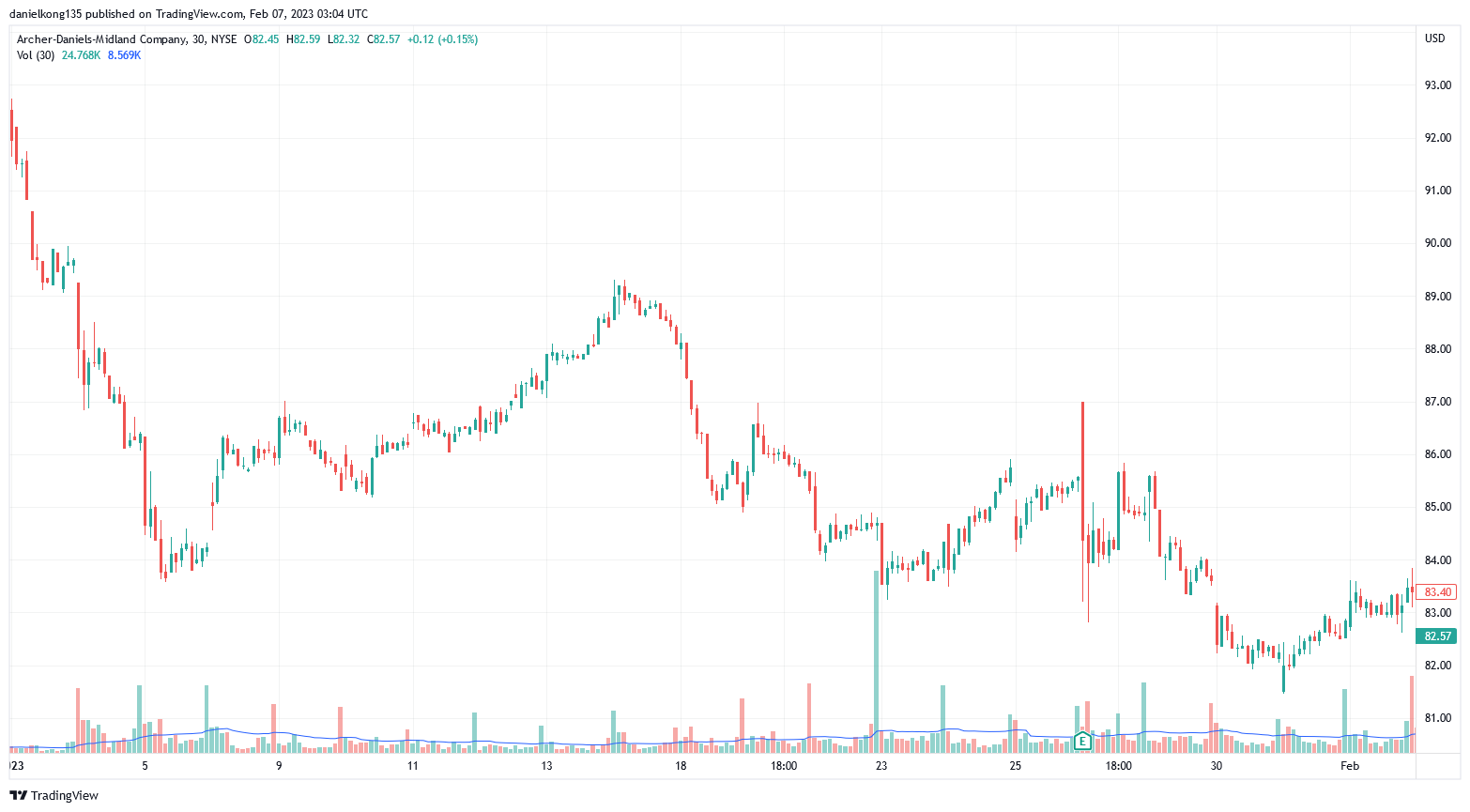 Figure 2: Archer Daniels Midland price chart over the month of January 2023. Image obtained from Trading View.