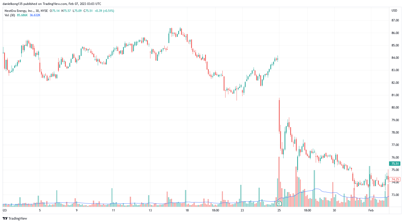 Figure 1: NextEra Energy price chart over the month of January 2023. Image obtained from Trading View.