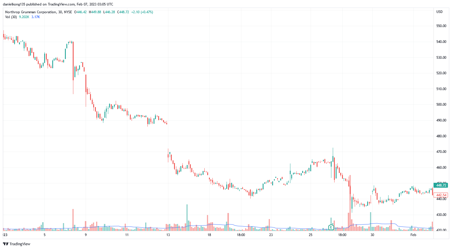 Figure 5: Northrop Grumman price chart over the month of January 2023. Image obtained from Trading View.