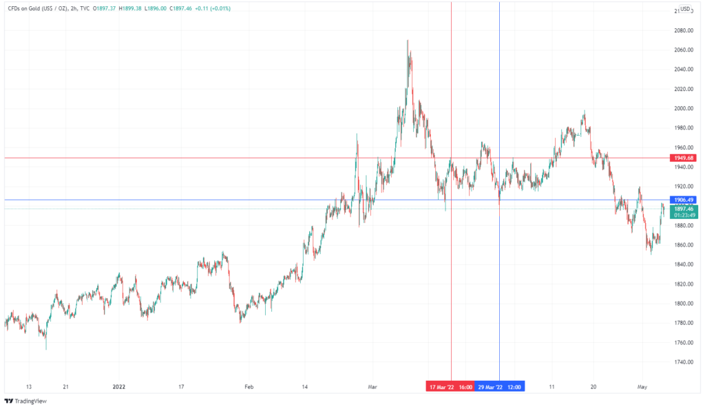 Por ejemplo, cuando el rendimiento del Tesoro de EE. UU. aumentó el jueves 17 de marzo de 2022, los precios del oro cayeron por debajo de los $1946. [1]