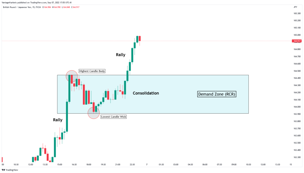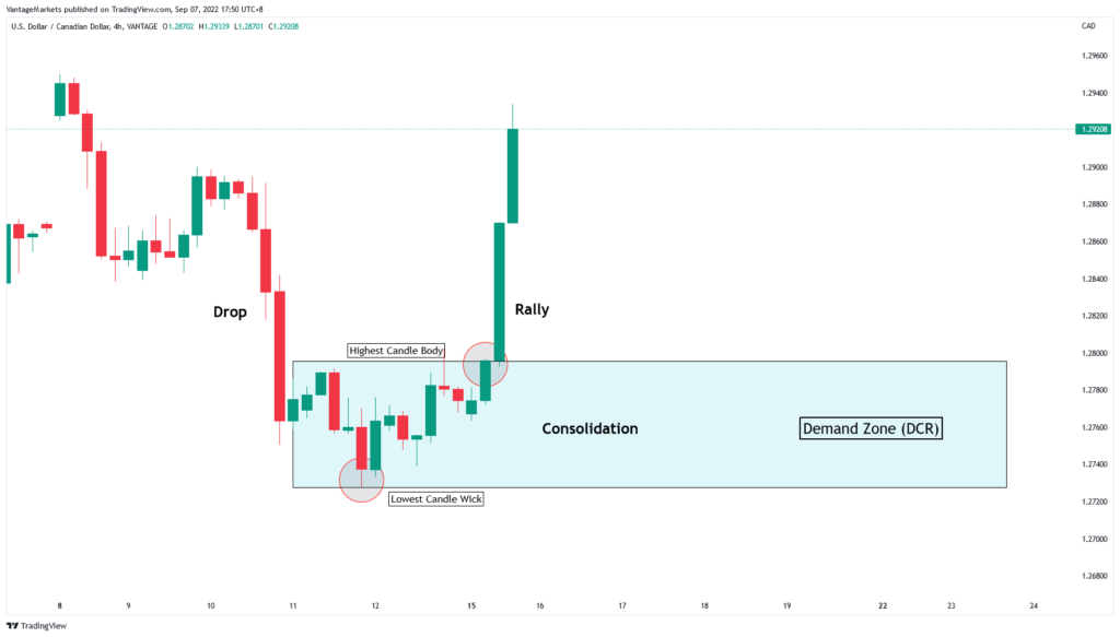 Las zonas de demanda se utilizan para los compradores en condiciones de mercado alcistas. Las zonas de demanda se pueden encontrar en las estructuras de mercado DCR y RCR, y se dibujan desde la mecha más baja hasta el cuerpo de la vela más alta dentro de la consolidación [4].