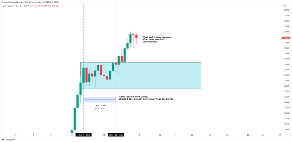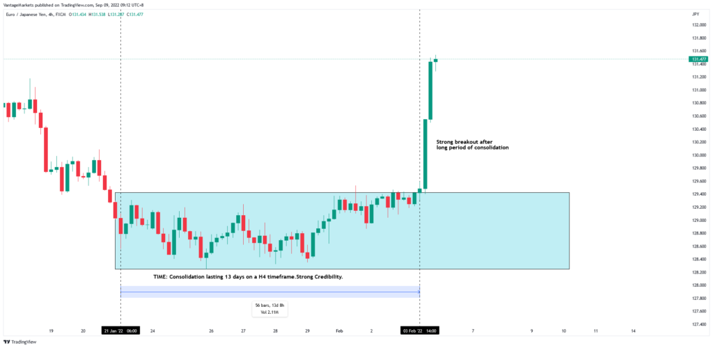En la Figura 5, la consolidación duró 13 días en el marco de tiempo H4, seguida de una fuerte ruptura alcista.
