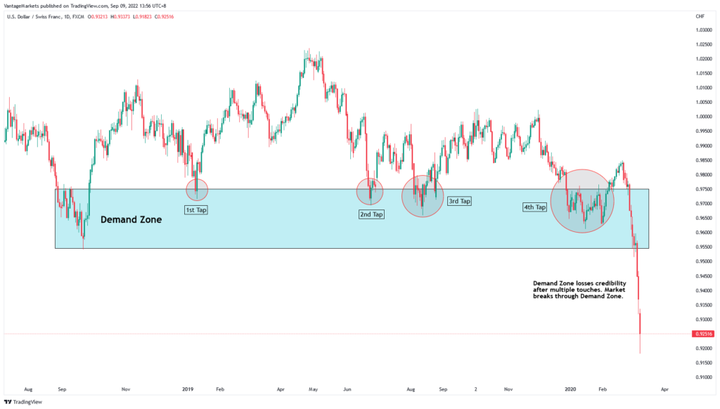 En la Figura 12, los mercados crearon un nuevo mínimo a través de un movimiento bajista impulsivo después de tocar la zona de oferta por primera vez, lo que perpetúa aún más la tendencia bajista general.