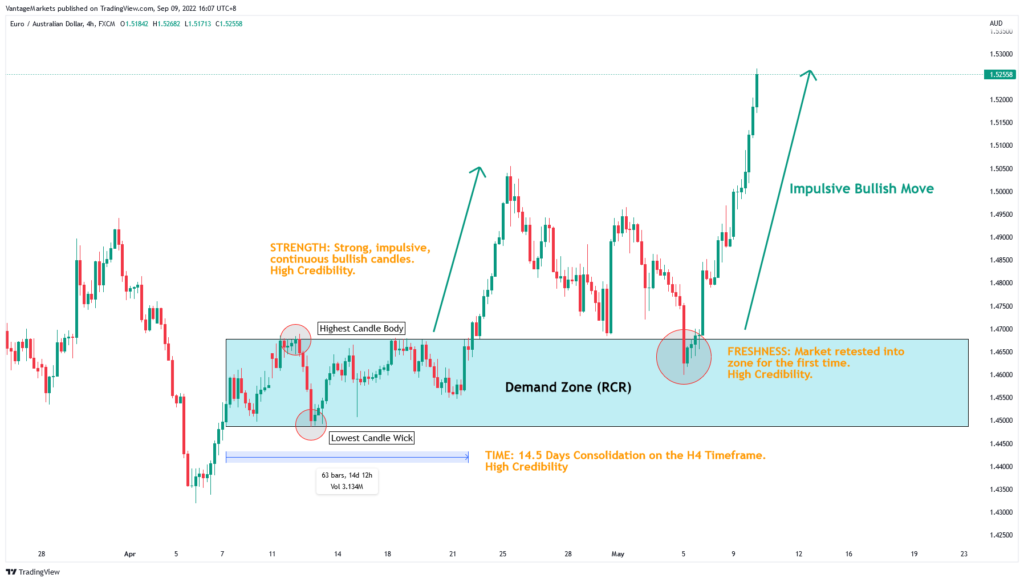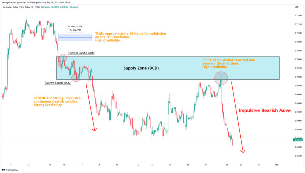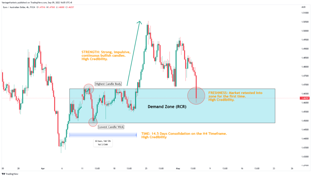 Al observar un gráfico, hay muchas áreas de consolidación, pero ¿qué hace que una zona sea confiable? Se basa en tres aspectos, que son básicamente las leyes de las zonas de oferta y demanda [5].