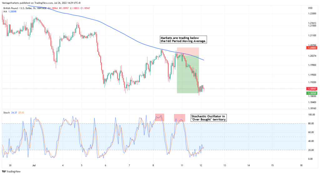 Figura 7 – Ejemplo de Venta en GBPUSD H1 con SMA de 160 Periodos y Estocástico (https://www.tradingview.com/x/Jb9zbuAi/)