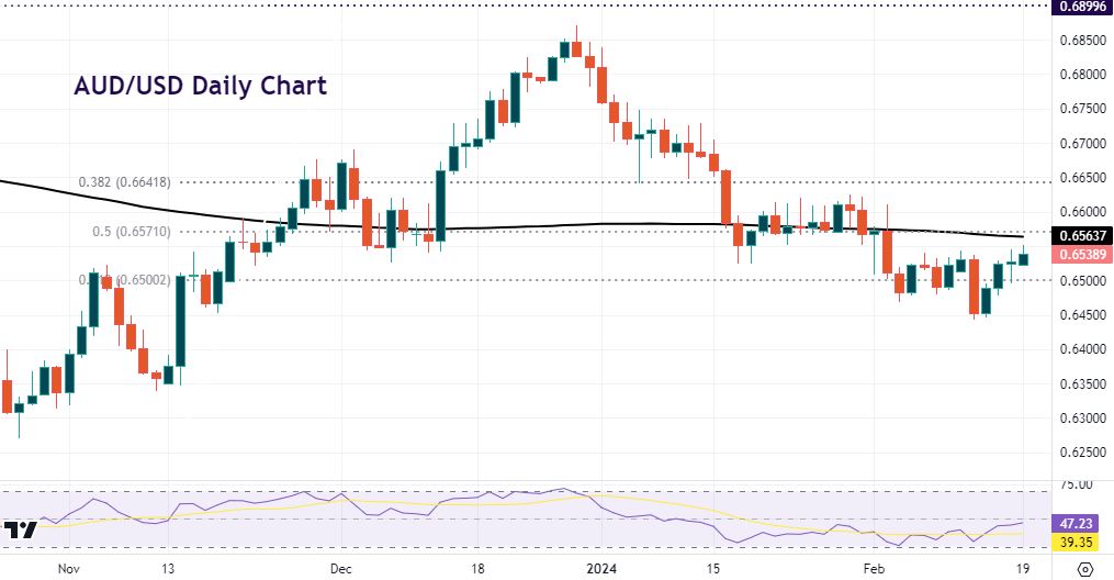 Softer job numbers and inflation data have challenged the RBA’s recent relatively hawkish bias. But the first rate cut isn’t priced in until August with a higher for longer stance expected to be kept by the central bank. That could potentially mean a lot less policy easing than the Fed and RBNZ too. Regarding China, we may have to wait until the early March for the Two Sessions meeting to see whether policymakers announce any new growth measures which could lift AUD. Further out, positioning could get more defensive ahead of the US election in November. Anti-China sentiment and rhetoric could see AUD struggle.
