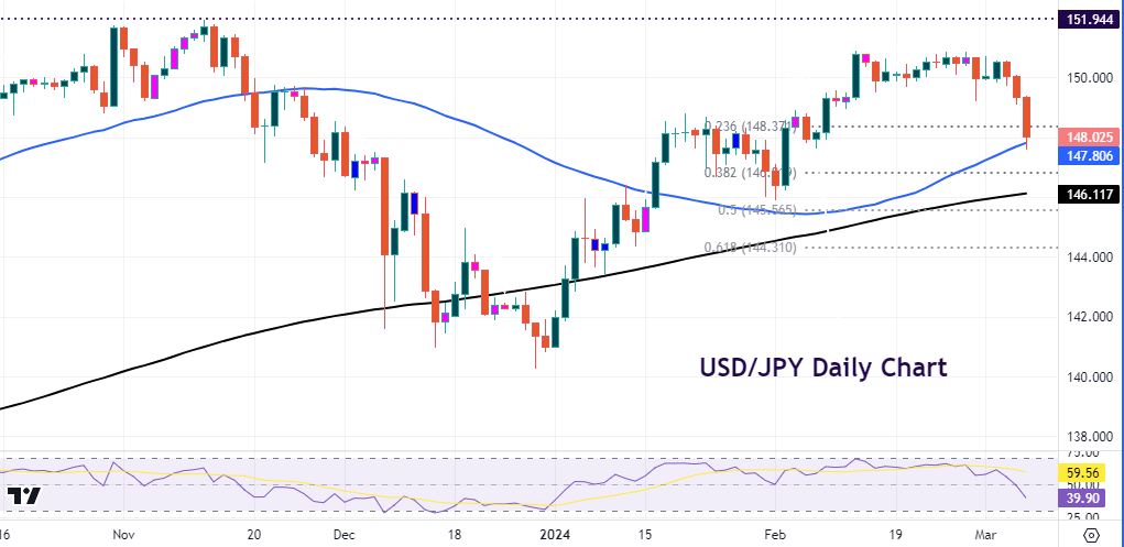 The Janaury stellar headline payroll figure partially caused the start of the bond yield move off its February lows. A sub-150k print is probably needed this time to push the 10-year yield closer to 4%. That should hit USD/JPY with the 50-day SMA at 147.80.