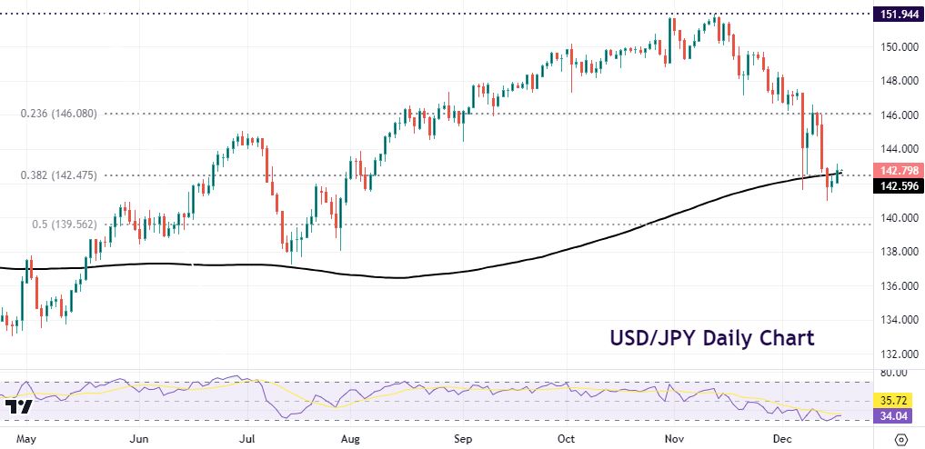 USD/JPY rose marginally above the 200-day SMA at 142.59. Traders are watching the BoJ meeting headlines closely for hints of a pushback against policy tweaks and hike expectations.