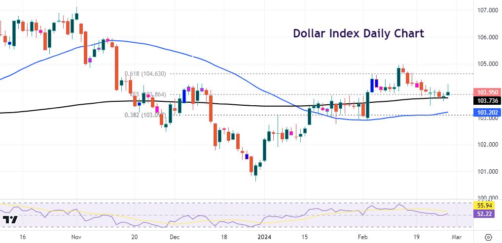 The dollar index has found support at the 200-day SMA at 103.73 and the 50% level of the fourth quarter rally at 103.86. If we get a soft report, then a move lower could find support at last week’s low at 103.43 A strong set of data could prices move up decisively above 104.