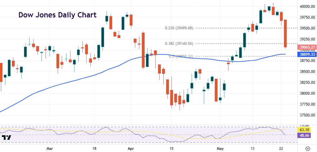After hitting a record high at 40,077, prices have struggled with yesterday’s move pushing the mildly overbought daily RSI down below 50. The index also closed below the Fib retracement level (38.2%) of the April low to May high at 39,140. The midpoint is at 38,850 with the 50-day SMA just above at 38,899.